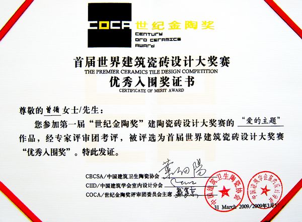 首届世界建筑瓷砖设计大奖赛优秀入围奖证书—爱的主题